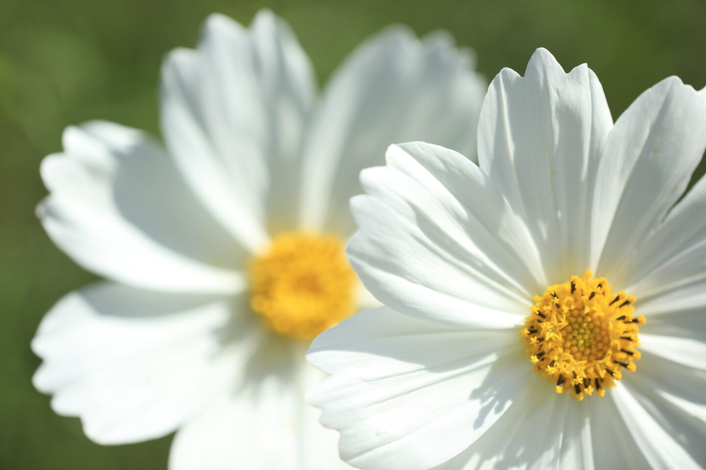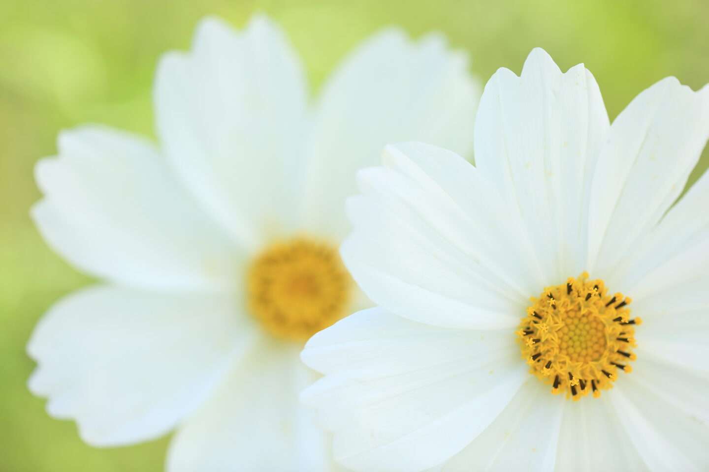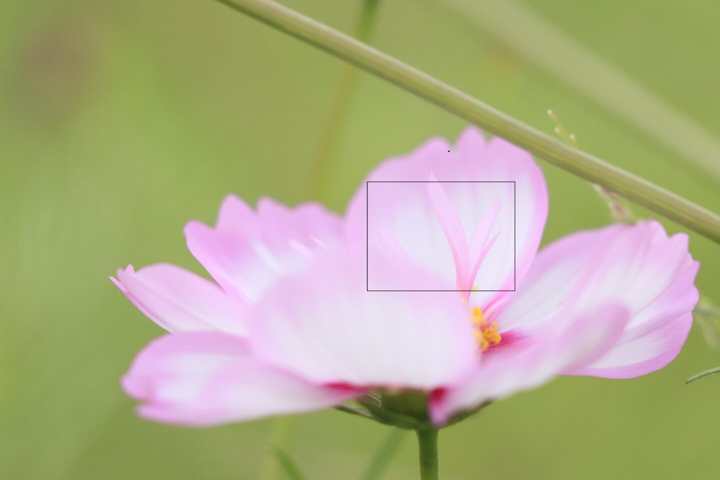 やさしい表情を引き出すには、曇りの日を選ぶのが理想的。あるいは、日陰に咲く花を被写体にすれば、柔らかな光が自然なトーンを保ってくれます。晴天時はA4サイズほどの厚紙で直射日光を遮るだけで、コスモスの表情はぐっと穏やかに。光をコントロールすることで、花が持つやわらかさや透明感は、より美しく引き立ちます。直射日光を遮断した影の中のコスモス、日なたのままの背景。その明暗差が、背景が鮮やかなライトグリーンに浮かび上がりました。