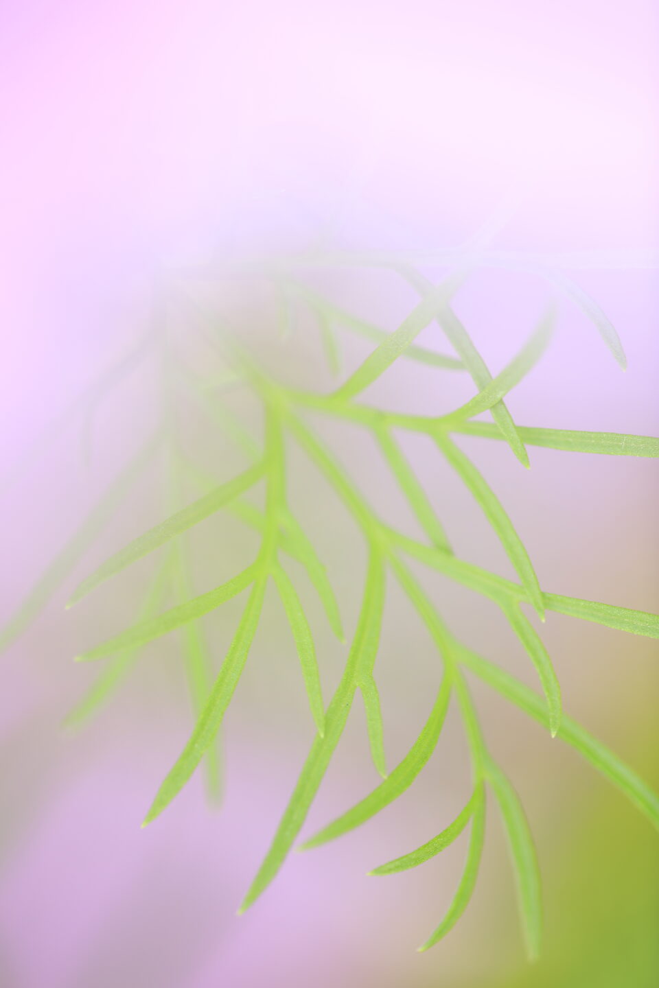 糸状に裂けたコスモスの葉は、他の花にはない繊細な造形美を宿しています。葉は「主役」としては力不足ゆえ、「脇役」の力を借りなくてはなりません。そこで、本来「主役」となる花を彩りとして「脇役」に。まるで名優を脇役に配するような、贅沢な演出です。マクロレンズで接近して捉えることで、浅い被写界深度が花を柔らかく溶かしてくれました。静かな舞台で、葉がそっとスポットライトを浴び、繊細な造形が静かに浮かび上がります。