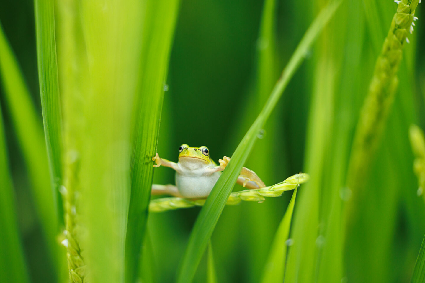雨上がりの曇り空、雲によって光が散乱され、均一な光が稲の隙間にいたアマガエルに降り注いでくれたので、柔らかな光で撮影することができました。光が柔らかいのでコントラストも弱くアマガエルの体の細部まで写し撮ってくれています。薄暗いためシャッタースピードが上がらず手ブレする可能性があったので、ISOを上げて撮影しました。