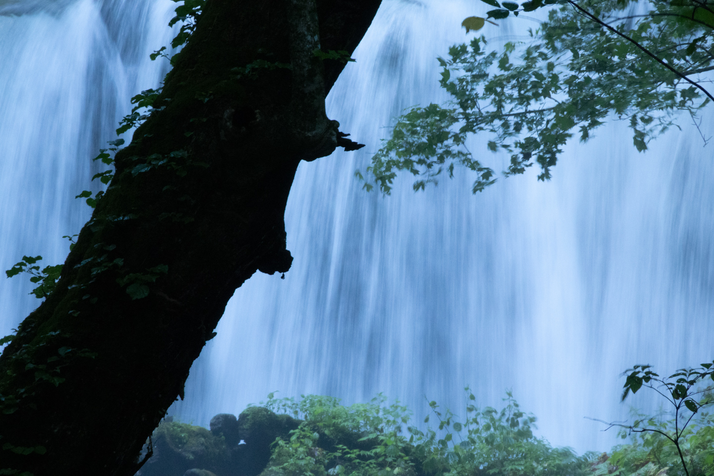 前景の木をシルエットで捉えつつ、背後の滝を圧縮構図で描写。望遠レンズの圧縮効果によって、距離のある要素同士がひとつの画面に密に収まり、空間に緊張感が生まれています。引き寄せの力が画面全体をドラマチックに演出しています。