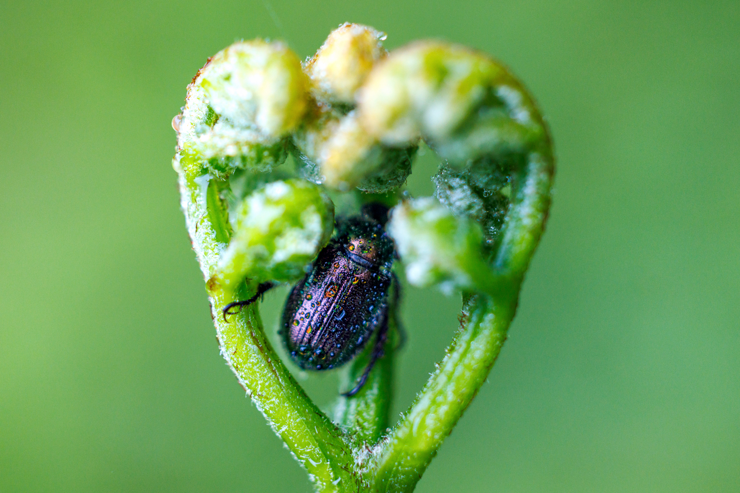 小さなコガネムシについた水滴さえも鮮明に写し出し、まるでそこにいるかのような質感です。1.4 倍のマクロレンズは非常に浅い被写界深度を持つため、背景のボケがとろけるように美しく写ります。この背景でより被写体が際立ち美しい写真を撮ることができます。