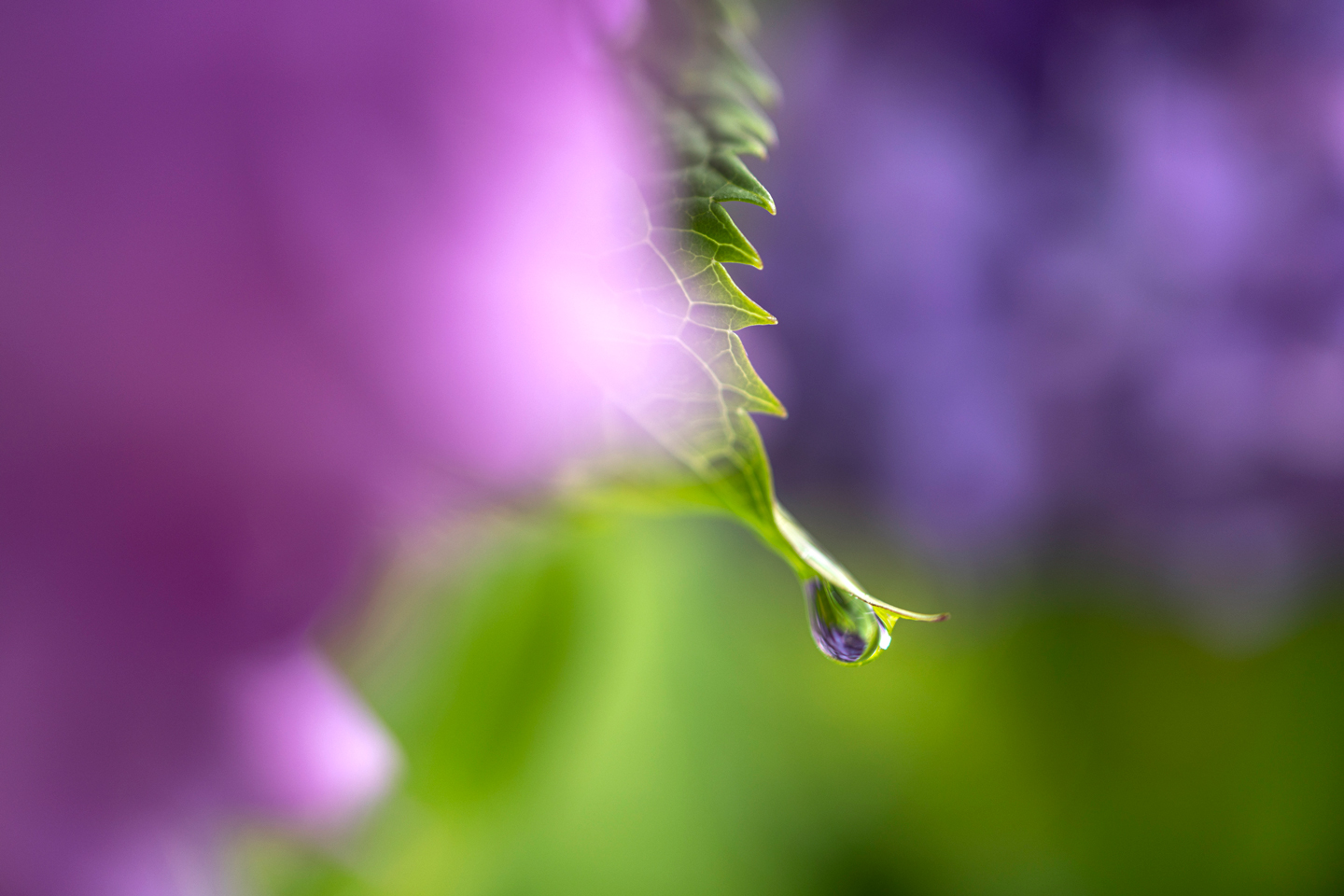 ハーフマクロの RF35mm F1.8 MACRO IS STM と RF100mm F2.8 L MACRO IS USM で同じ被写体を撮影していますが、1.4 倍だとここまで大きく雫を写すことができるので、水滴の中のアジサイを主役にすることができます。