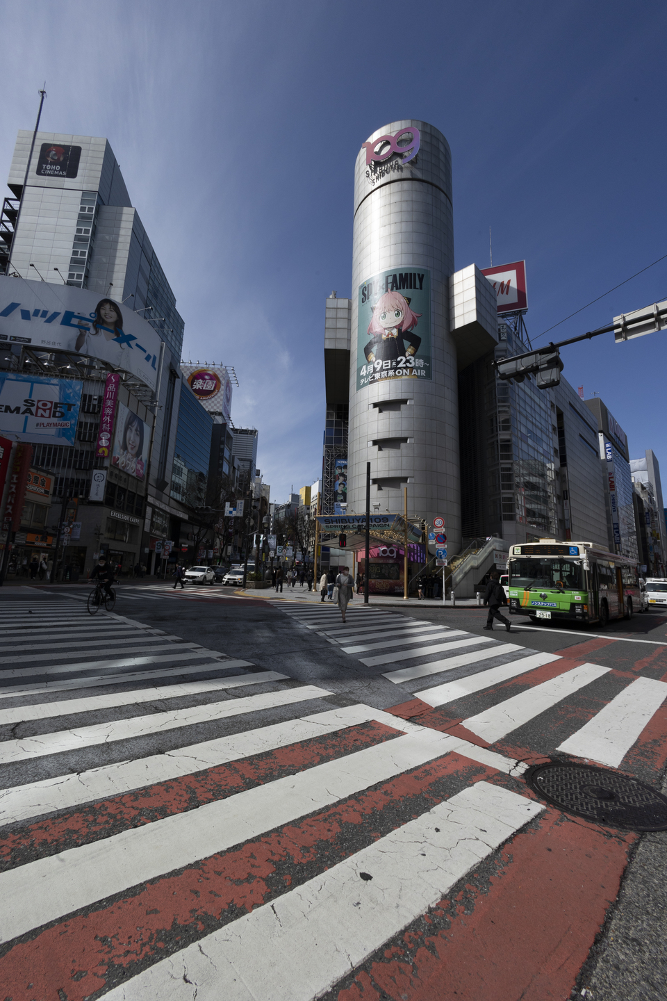 縦でも撮ってみました。手前が大きく後ろが小さく写る広角レンズの特徴によって、横断歩道のシマシマがやけに目立ちます。渋谷のような雑多な街並みはパースペクティブを生かした表現がよく似合います。