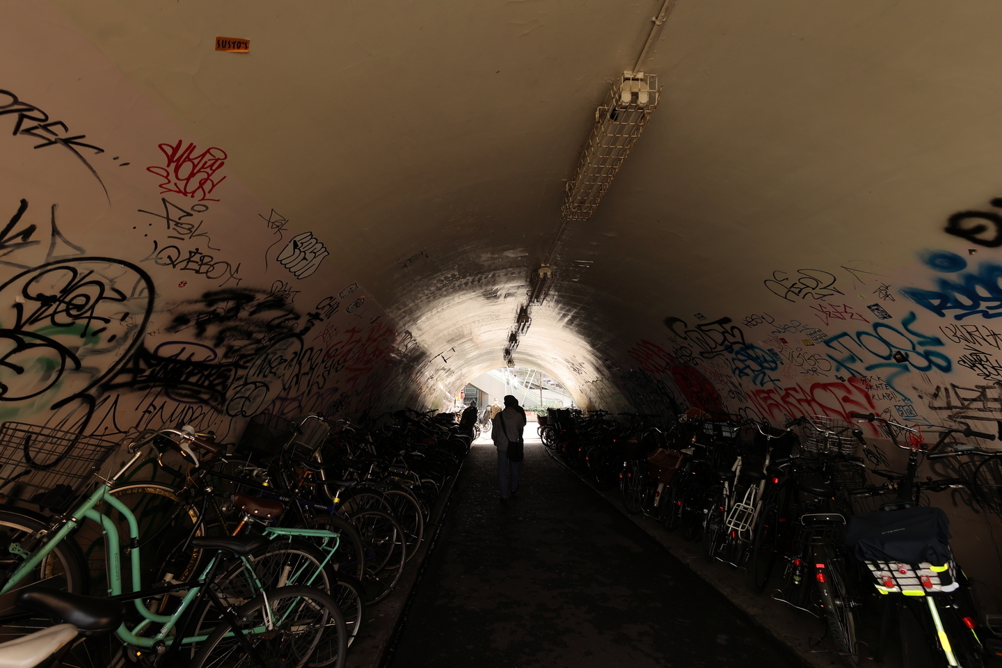 宮下公園に繋がる小さなトンネル。狭い路地などは、より奥行きが強調されてユニークな描写が得られます。両サイドの自転車の金属部分に微かな光が当たり良いアクセントとなっています。