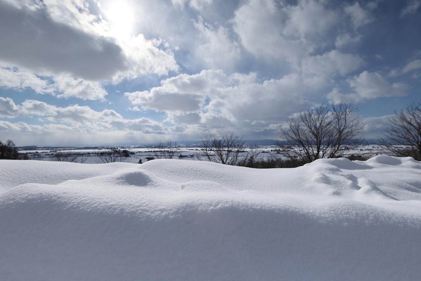 平野が広がる北海道ならではの光景が望める高台へ。水平垂直をしっかりと出したい風景写真で広角レンズを使用する場合、その美しさを歪みが邪魔をする場合がありますが、見ての通り自然に写っているのがわかります。手前の雪の質感も美しく再現され、ダイナミックな空も立体的に捉えられています。