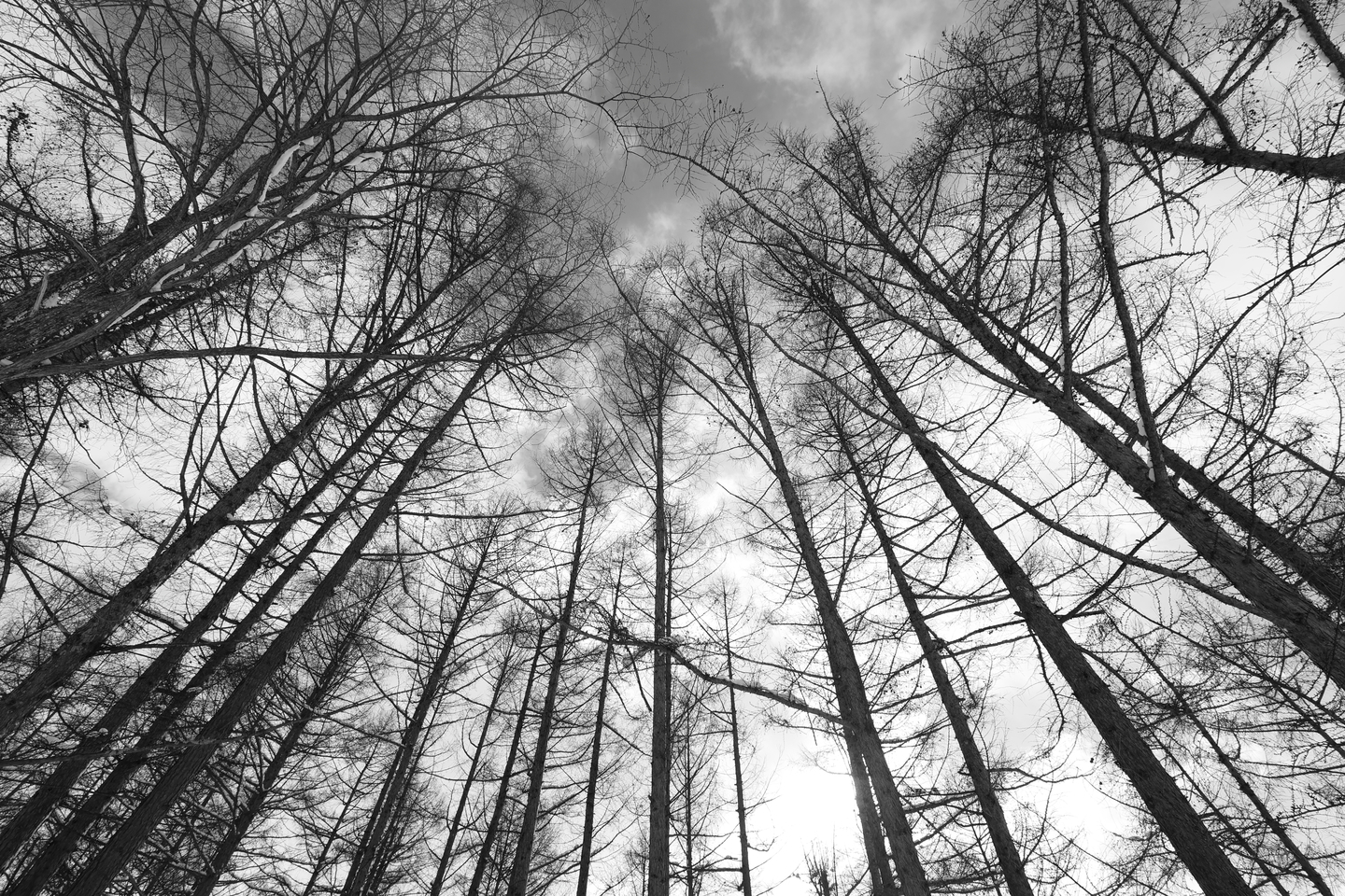 背の高い樹木を真下から狙いました。アングルの工夫によって、超広角レンズの特徴であるパースがより生かされます。モノクロに変換してみましたが、黒のグラデーションが美しく表現されてるのがわかります。