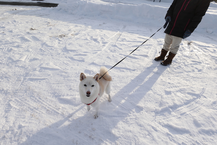 カメラを向けると興味津々でこちらに近づいてきた散歩中の白い犬。轍や足跡が付いてる雪の道が画面いっぱいに写り、雪国らしいスナップ写真に。画面隅に飼い主さんが配置されたことで歪みが生じ、犬と人間のサイズ感に違和感を持ちますが、これこそ超広角レンズのおもしろさでしょう。