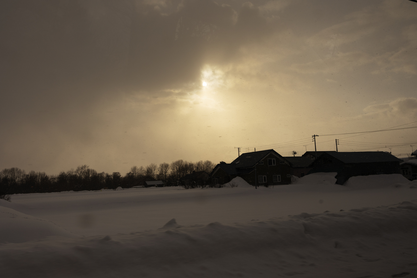 移動中の車窓から。曇り空から太陽が顔を出しました。汚れのように見えますが、細かい雪が舞っています。ガッツリと風景写真を撮るというよりは、どんな場面でも気軽に撮るスタイルがマッチするレンズですね。