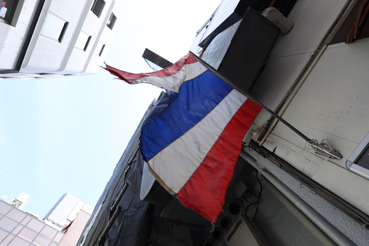 上を見上げると古びた旗が靡いていました。建物の隙間から狭い空が覗く光景は都市ならでは。普段はアイレベルがほとんどですが、ワイドなレンズを持つと色々なアングルで撮りたくなります。