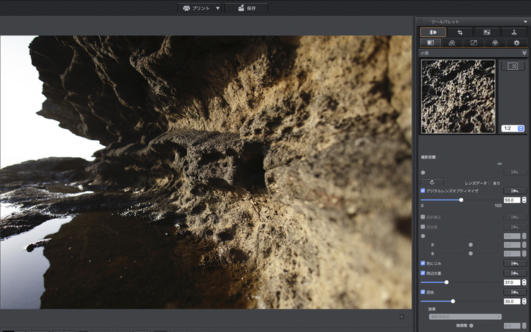 歪曲収差などが気になる場合はキヤノンの純正現像ソフト「DPP(Digital Photo Professional)」で現像すると、自動修正で補正されます。自然風景は曲線で構成されていることもあり、歪みはそれほど気にならないのですが、人物やスナップ、建物などを撮る時は「RF16mm F2.8 STM」とDPPをセットで使うといいでしょう。この写真はDPPの画面キャプチャーです。