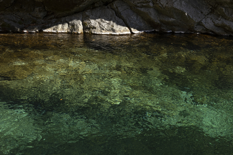 山梨県の沢で撮影。ピントは画面の上1/3ぐらいの水面に合わせています。ゴツゴツした岩の描写がシャープなだけでなく、水面の質感や色彩も細部豊かに再現されています。水の質感を描くときのポイントはシャッタースピードです。この作例は1/500秒の高速シャッターで撮影しました。