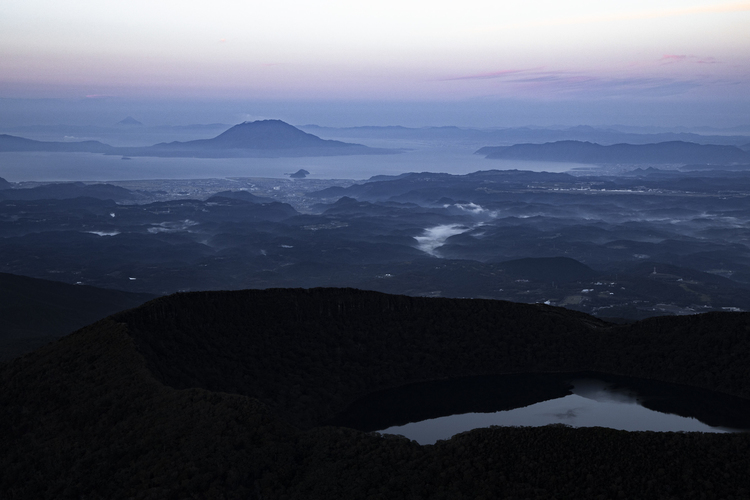 鹿児島県・宮崎県の県境、早朝の韓国岳から桜島方面を捉えた一枚。手持ち撮影。