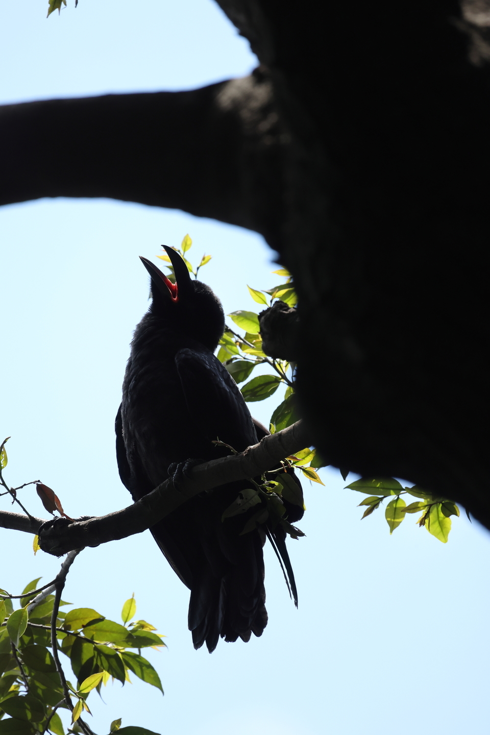 毛がモコモコしていて、あどけない仕草をみるとカラスの子どもでしょうか。晴天でも高速シャッタースピードを確保するためにISO感度1600。ノイズは全く発生せず、お腹や頭の毛の柔らかさや光によって黒光りしている翼の質感が潰れることなく美しく再現されています。なぜか、口を開けたまま上を向いている姿勢を数分間続けていました。かわいいです。