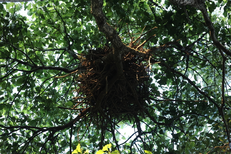 元はカラスの巣だったみたいですが、空き家になったためツミが使っています。真上に向けてカメラを構えると不安定になりブレやすくなるので、敢えてISO感度を12800に設定して撮影してみました。さすがにノイズが出てきました。とはいえ、絵柄のせいか、あまり気にならないです。