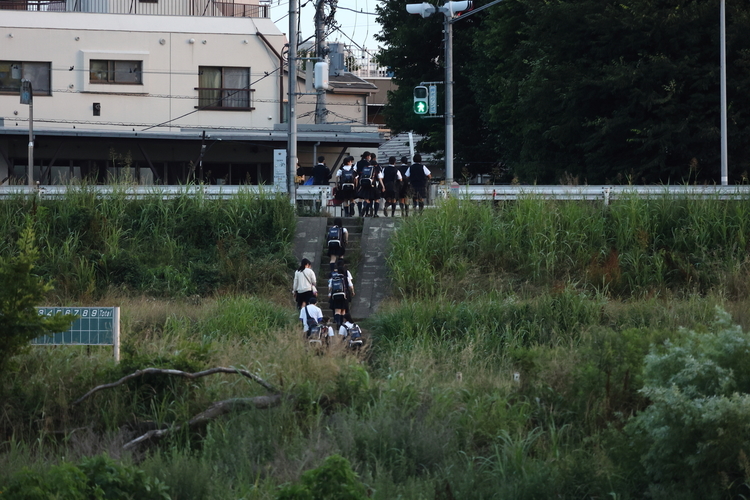 多摩川で撮影していると、向こう岸に学生たちが土手の階段を上っている姿を発見しました。こんなときに、超望遠レンズがあるとスナップができちゃう。鳥の撮影の合間に、歩きながらスナップもしています。
