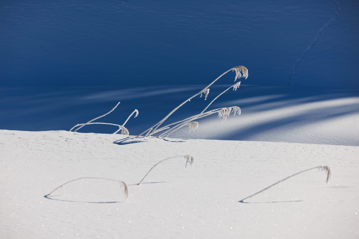 凍りついた葦が印象的だったので、その葦を主役に引き立てるため日陰で青い雪原を背景にしています。実はこの葦の横には除雪車で巻き上げられた雪が左側にありました。それをいれてしまうと現実感が生まれてしまうため、望遠ズームを使い画面を整理しています。画面を整理することで主役が明確になり、自分の見せたいものを見ている人に伝えることができます。