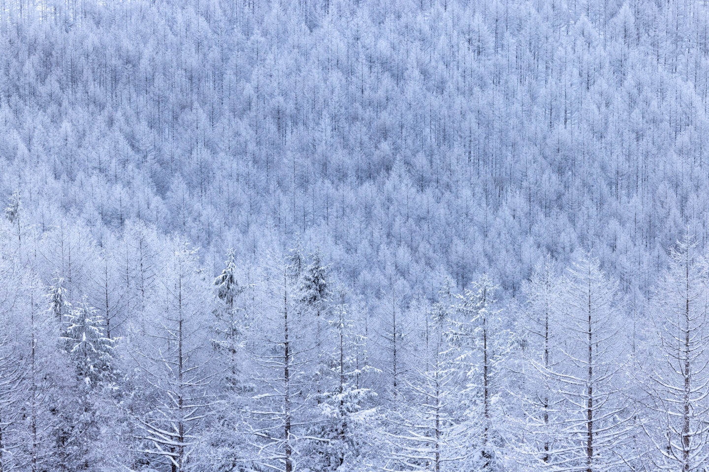 氷点下10度になった朝、森は一面真っ白で霧氷に覆われていました。曇天なので柔らかな光で撮影できるのですが、この場合はシャッタースピードが遅くなりがちです。この時もシャッタースピードは1/15秒と今までのレンズだと手ブレしてしまう可能性があります。ですが強力な手ブレ補正のおかげで、手持ちでサクサクと撮影ができました。