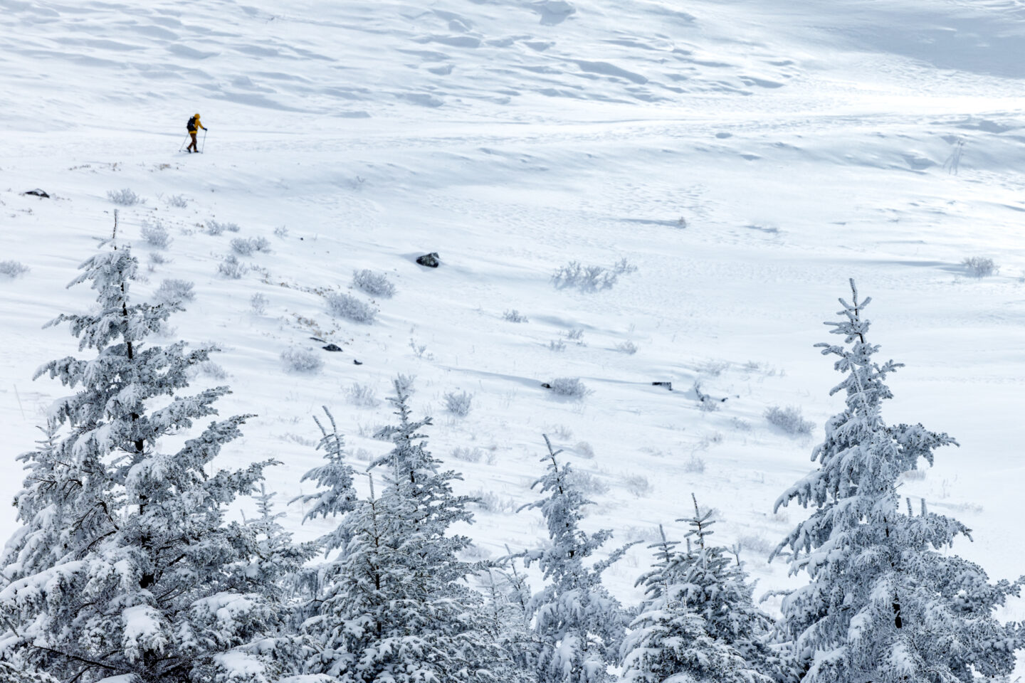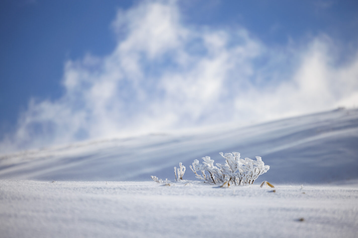 上の写真の手前に写っている霧氷がついた木は、実際は小さいのですが、焦点距離200mmで撮影したことで奥に写る雪山や雲に負けない存在感になりました。