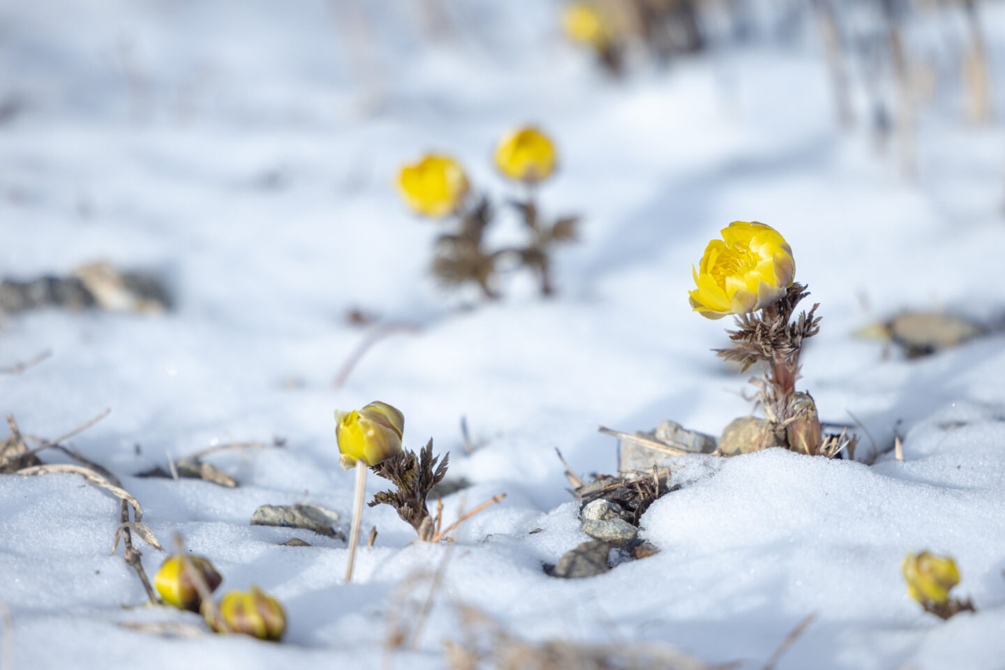 こちらのフクジュソウも背丈10cmほどの小さなお花ですが、雪の中から春を告げるように姿を見せてくれていました。こちらも小さなお花なので、バリアングルを使い地面スレスレのローポジションで撮影をしています。200mmのテレ端F2.8で撮影したので、主役にした右のフクジュソウはシャープに写しながらも、後ろの脇役のフクジュソウも美しいボケがちゃんと主張してくれています。