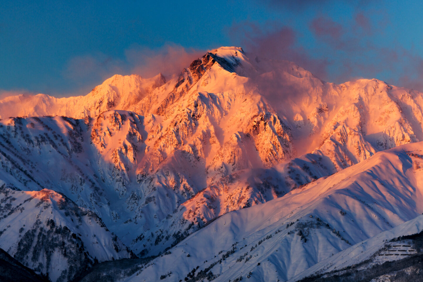 上の写真の場合、太陽が昇り始めた直後の真っ赤な光で、山々を赤く染めるモルゲンロートが主役なので、200mmでぐっと寄り何を見せたいのかを明確にしています。望遠で寄ったことにより赤く染まった雪山が迫力ある一枚になりました。