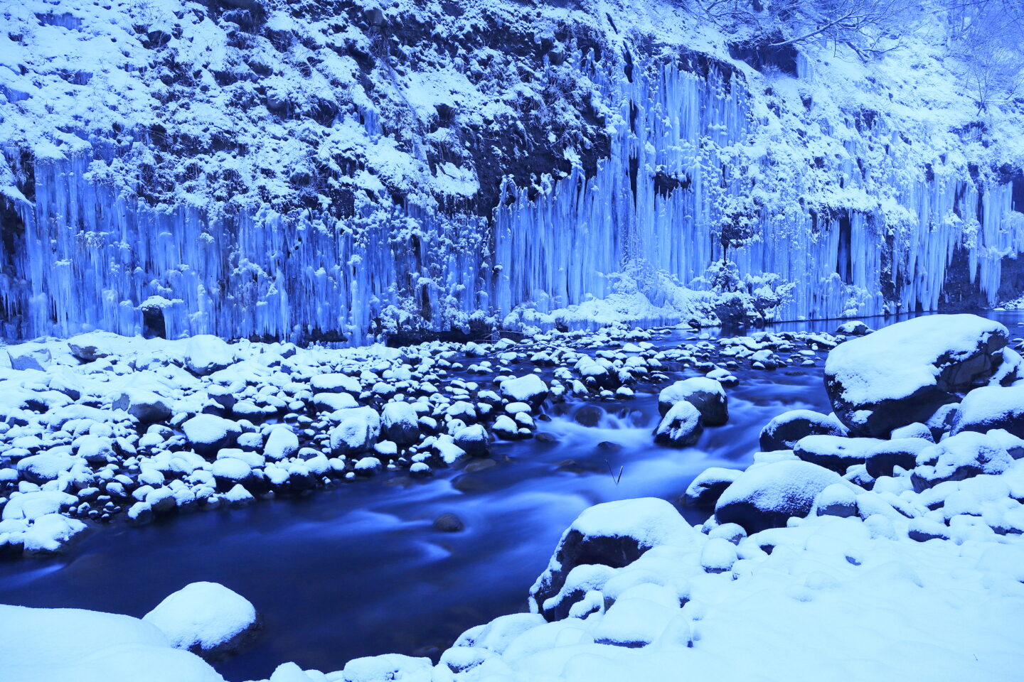 長野県木曽町の白川氷柱群を夜明け前に撮影したとき、ホワイトバランスを「太陽光」に設定すると、画面全体に青みが増して写りました。この「青み」は寒色であると同時に、冬の冷たさや静けさを印象的に表現してくれます。実際に写真を見た方の中には、「白熱電球」設定で撮影したのでは?と感じる方もいるかもしれません。