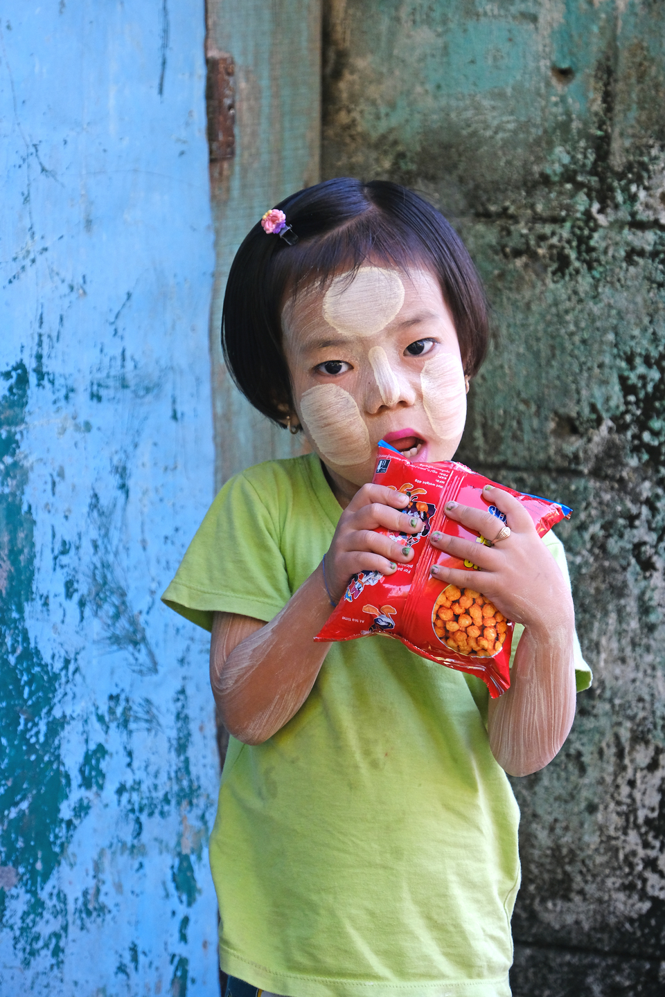 ミャンマーの伝統的な日焼け止めとお化粧を兼ねた「タナカ」をつけた少女。ミャンマーでは恥ずかしがり屋さんが多く少し距離を置いて撮影することにより自然な表情を引き出すことができました。余裕のある焦点距離のおかげです。