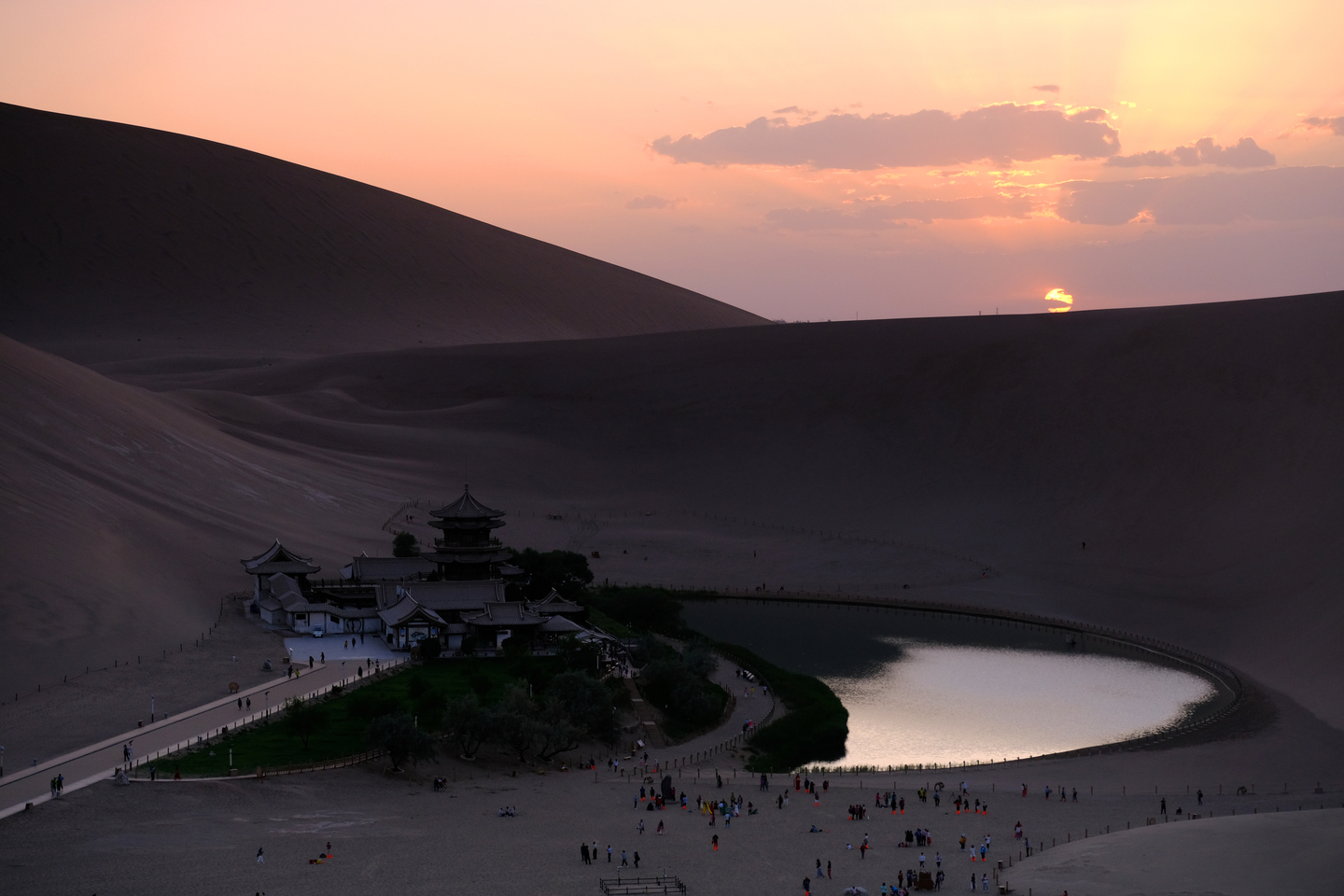 中国敦煌にある1000年以上枯れたことがないと言われる月牙泉。人の目の見た感じに近いといわれる50mmで撮影しました。逆光での撮影で普通なら手前の砂漠は黒くつぶれてしまうこともありますが、しっかりと暗部の質感も残っています。
