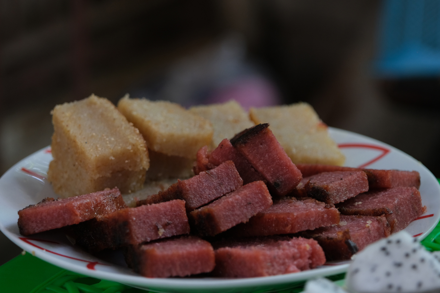 ミャンマーでよく食卓に出てくるサンニュイマゲンというバナナと餅で作られた伝統的な甘いお菓子です。望遠側の80mmを生かしてマクロレンズ的な撮影をしてみました。