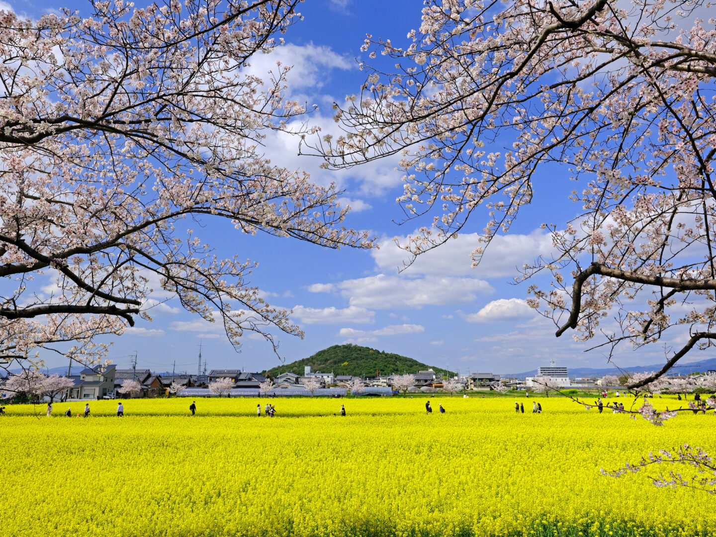 日本で最初の都が置かれたとされる藤原京は、春は桜と菜の花とのコラボレーションが見られる人気スポットです。広角レンズで切り取ると青空とのコントラストがとても綺麗でした。