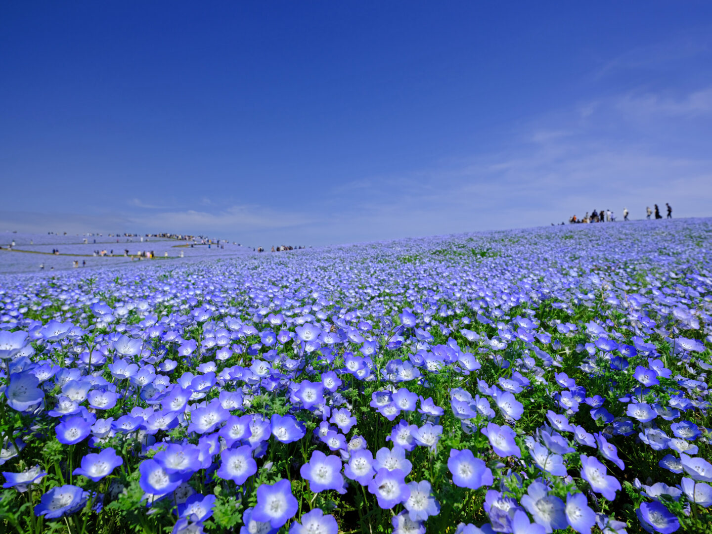 ネモフィラの花で有名なひたち海浜公園ですがとにかく人が多かったです。そんなときは広角レンズでぐっと花に近づくと遠近感が強調され、後ろにいる人々もあまり気にならなくなりました。