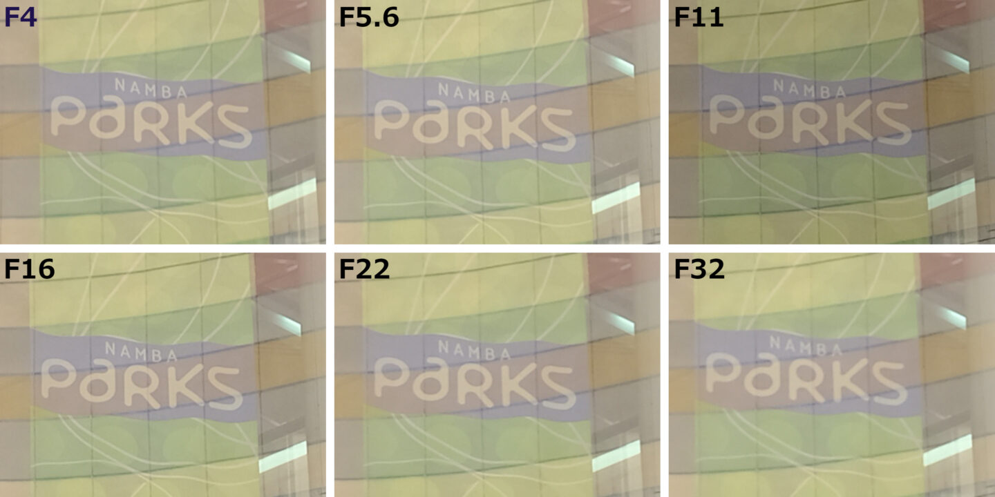 高画素のラージフォーマットセンサーの能力を最大限に引き出すためにレンズの解像度はとても重要です。特に広角レンズの場合気になるのが周辺部の画質です。下記作例の中央部分と周辺部分をピクセル等倍で切り出してみました。中央部分は絞り解放から良好な画質でF11からF16あたりが最も解像度が高い結果となりました。ピントは中央付近に合わせていますがF11くらいになると画面全体にピントがあったようになり、周辺部分の画質も良好な結果となりました。