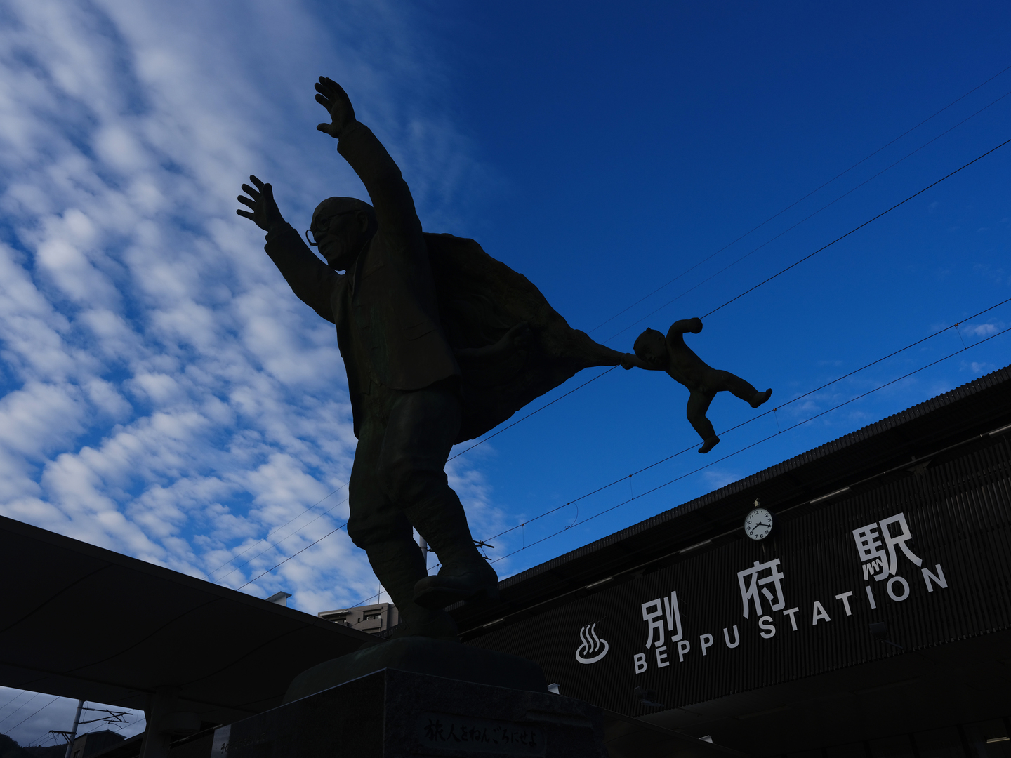 別府の駅前に面白いモニュメントを見つけました。大きなレンズだとわざわざ取り出して撮影していなかったかも知れません。(別府市の観光開発に尽力された油屋熊八という方の像だそうです)