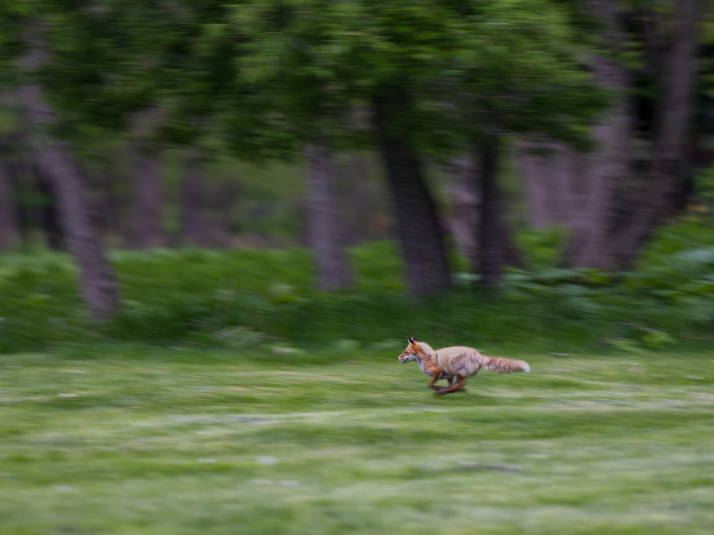 疾走するキタキツネの流し撮りに対しても「GF500mmF5.6 R LM OIS WR」の手ブレ補正機構が効果を発揮してくれました。