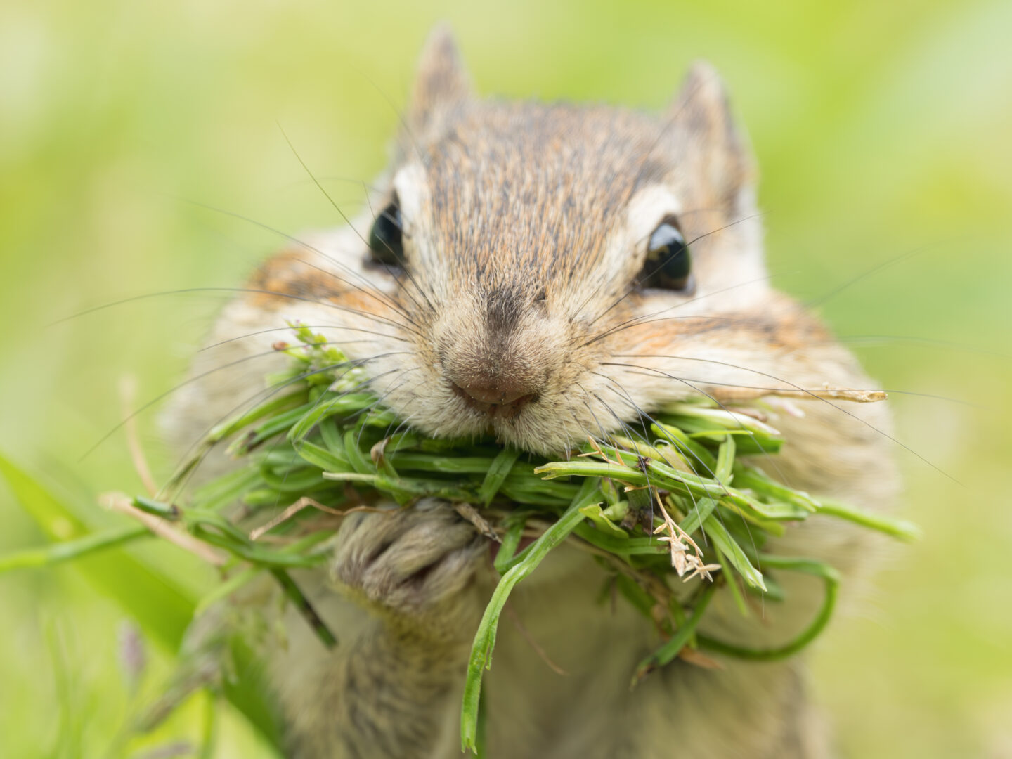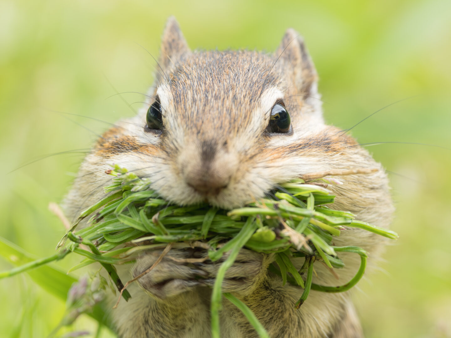 【1】のカットは被写体の鼻先にピントが合っています。【2】のカットは被写体の瞳にピントが合っています。エゾシマリスの鼻先から瞳までの距離は僅か約2cm程です。