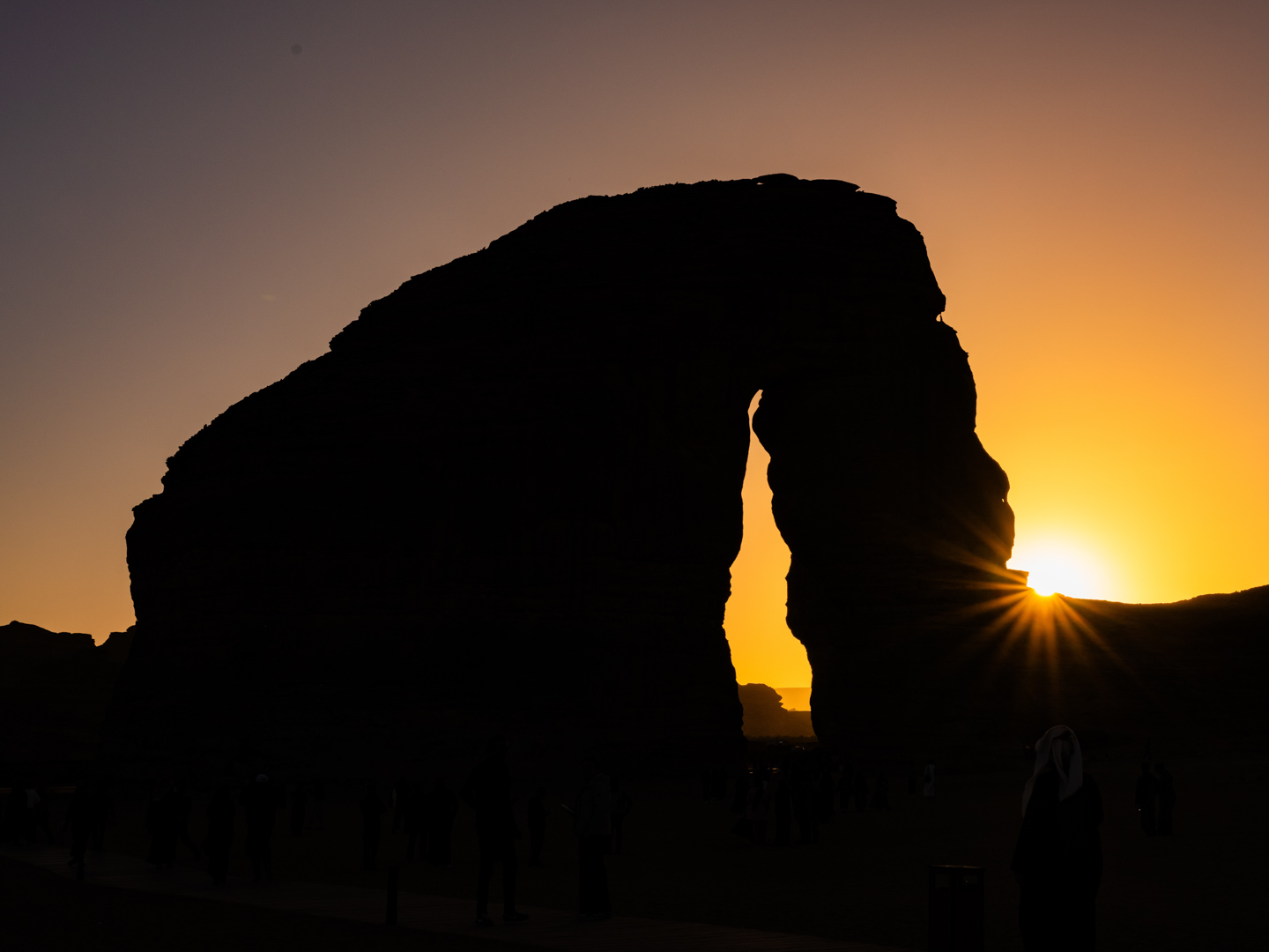 現地でレンタカーを借り、まず向かったのはサウジアラビアの観光プロモーションでも象徴的に使われる「エレファントロック」。砂漠の中に突如現れる巨大な象の形をした岩石は、まさに自然の造形美です。沈みゆく夕日の光が岩肌の凹凸を際立たせる瞬間を狙い撮影しました。画面上部から地平線へと向かう空の滑らかなグラデーションをとても綺麗に表現することができました。ラージフォーマットならではの余裕を感じさせます。
