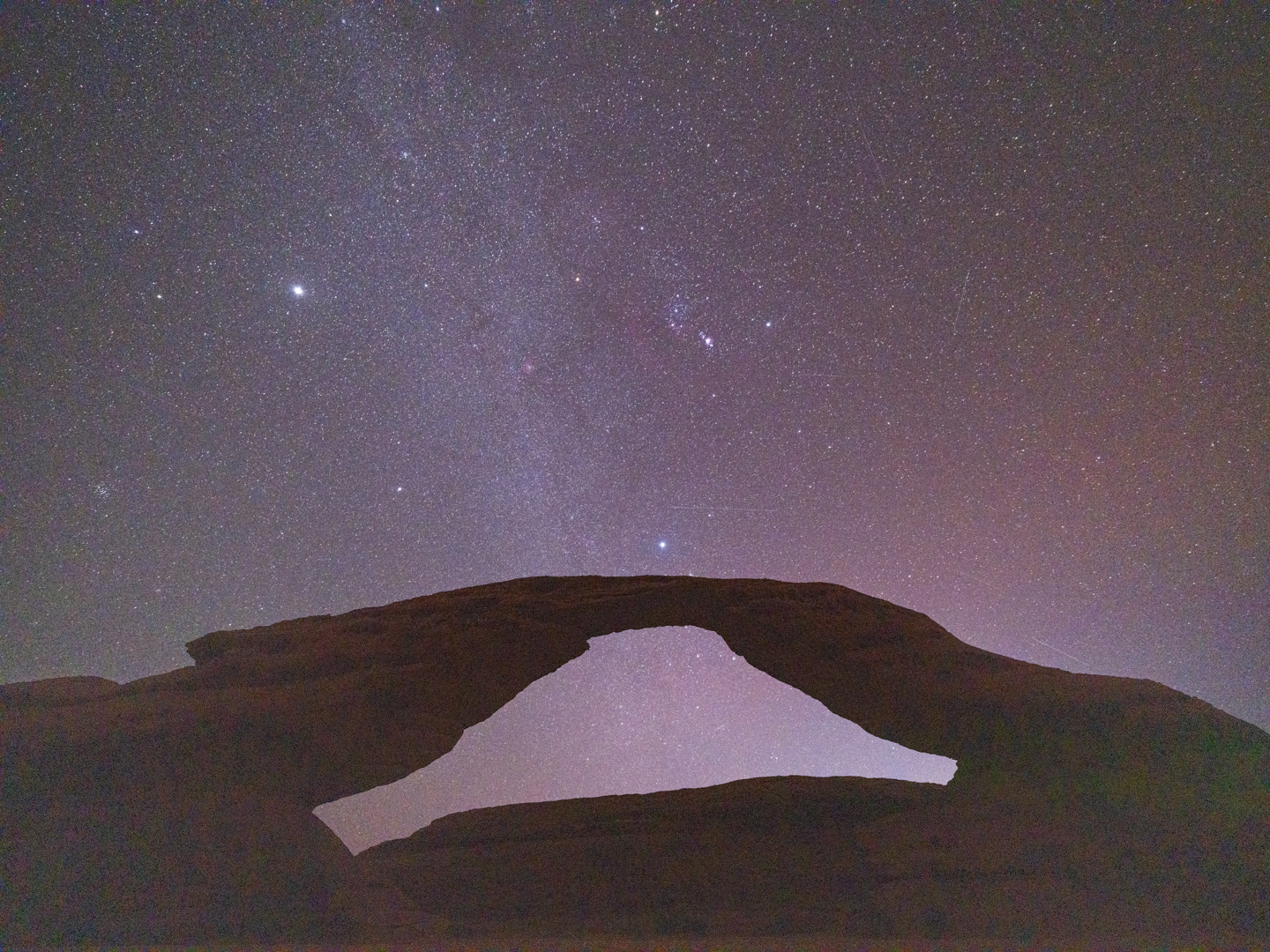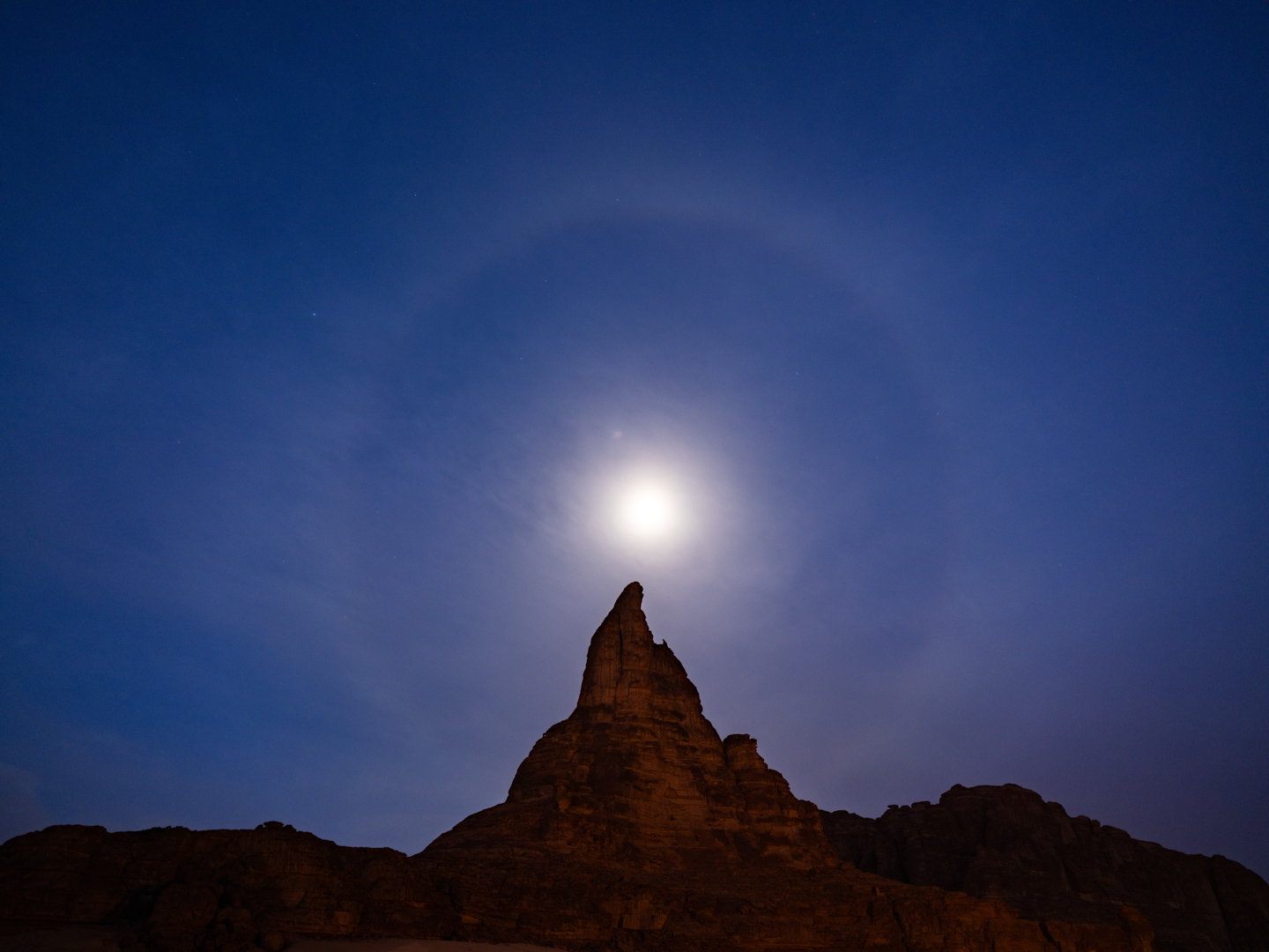 一方、こちらは同じアルウラの地で、深い夜の静寂の中で捉えた瞬間です。奇岩の真上に月が重なり、まるで岩が月を冠しているかのような荘厳な姿を見せてくれました。月を囲む「月暈(つきがさ)」の淡く柔らかな光の輪まで写し取ることができました。