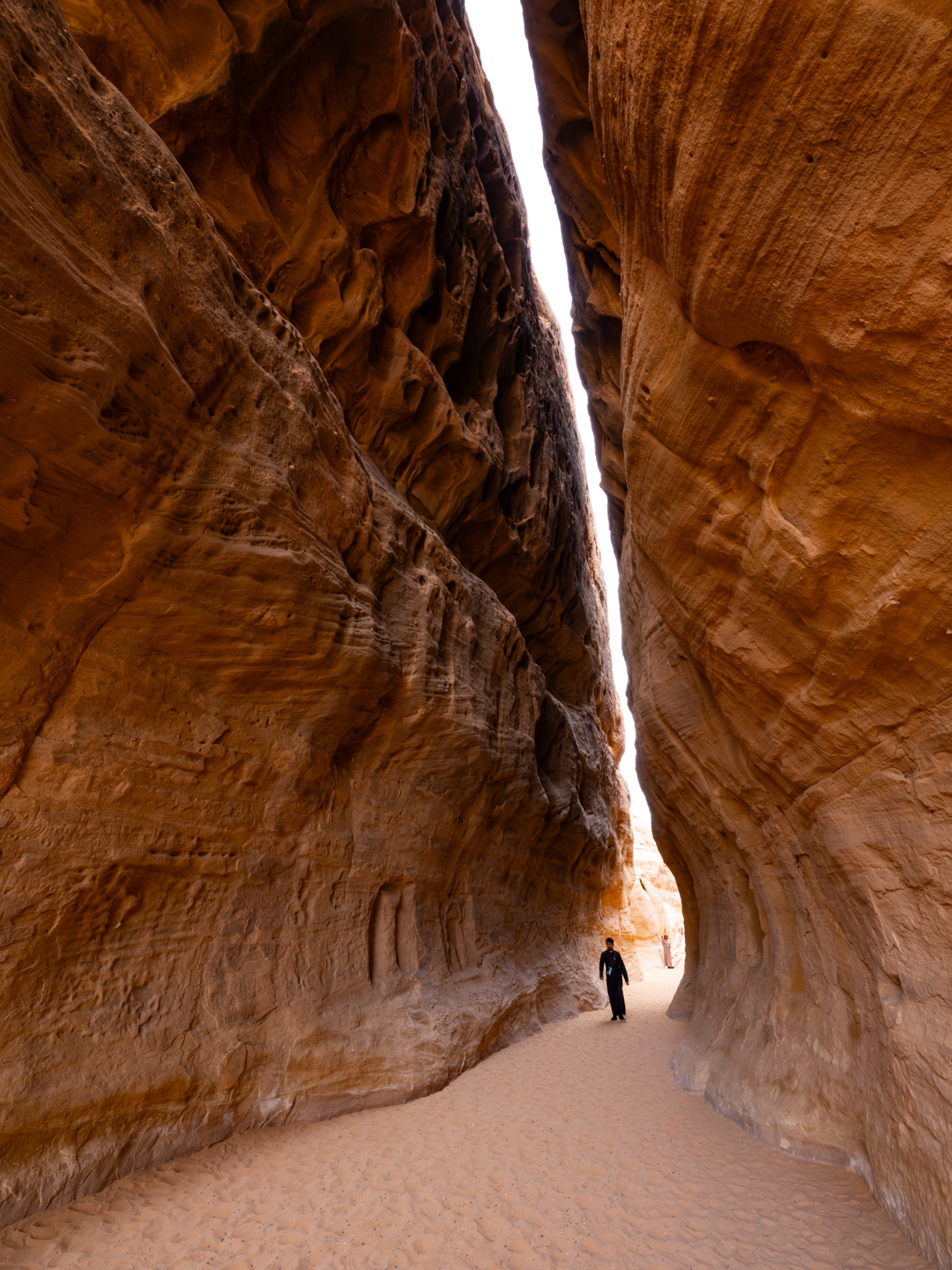 荒野に刻まれた巨大な岩の裂け目(シーク)。その圧倒的なスケール感を余すことなく伝えるため、奥に人物が来たときに一緒に撮影し、その巨大さを強調しました。
