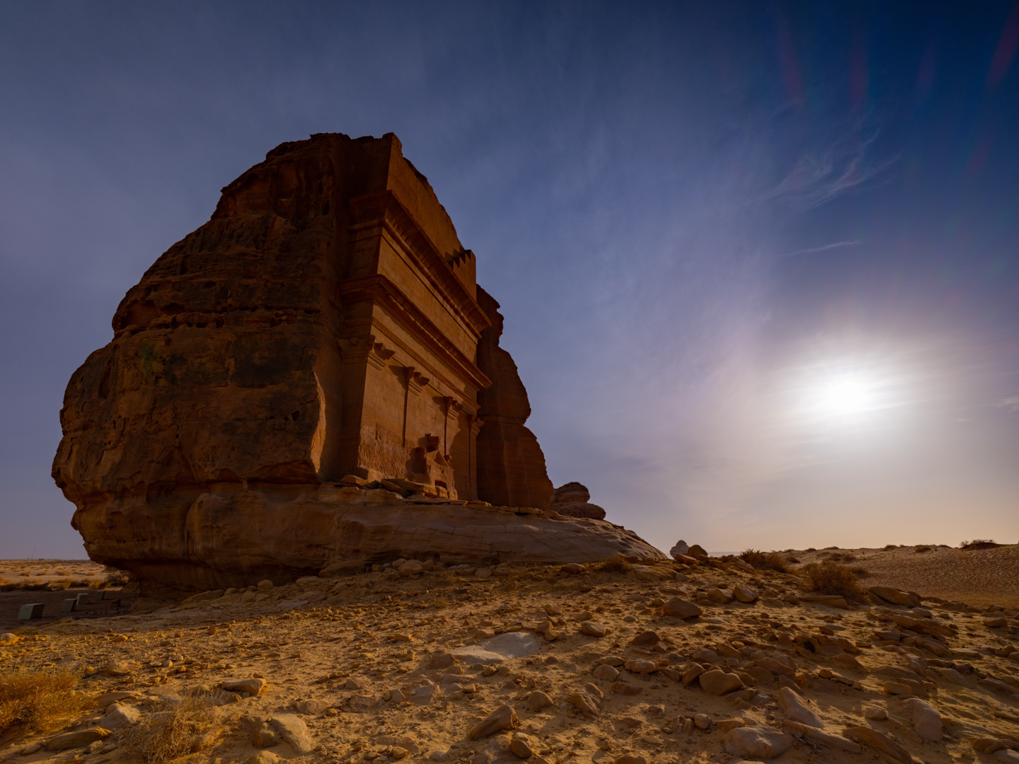 ヘグラ遺跡の中でも最も有名な「カスル・アル・ファリード(孤独な城)」。巨大な一枚岩を削り出して作られた精緻な装飾を、1億画素で完璧に捉えています。この場所は午後の光で遺跡に光が当たるため、最終バスの時間まで粘り西日に照らされる遺跡の姿を記録しました。