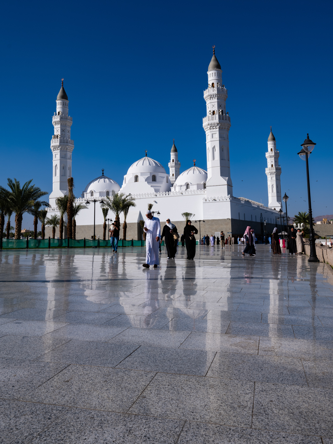 聖なる場所である預言者のモスク周辺では、三脚はもちろん、大型カメラの使用が禁止されています。ラージフォーマットのGFX100S IIはどうしても存在感が大きく、こうした場所では目立ちすぎてしまいます。そこで、ここではサブ機として携行していたコンパクトなX-M5とパンケーキレンズに切り替えることにしました。