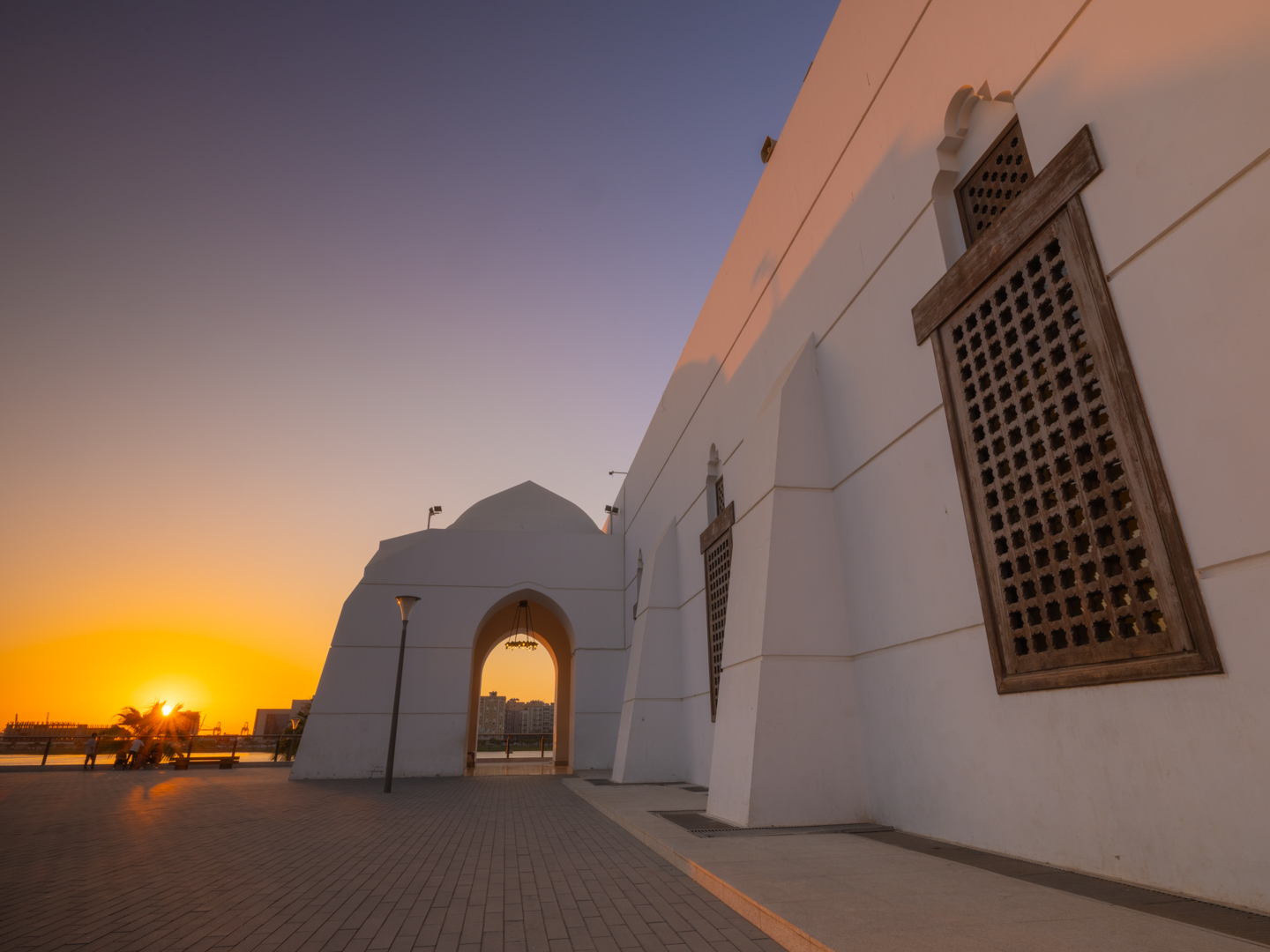 旧市街の熱気を抜けて辿り着いた海岸沿いで、この旅を象徴するような光景に出会いました。白亜のモスクが夕陽を浴び、その陰影が古都の記憶を刻んだ「ロシャン」を浮かび上がらせていました。