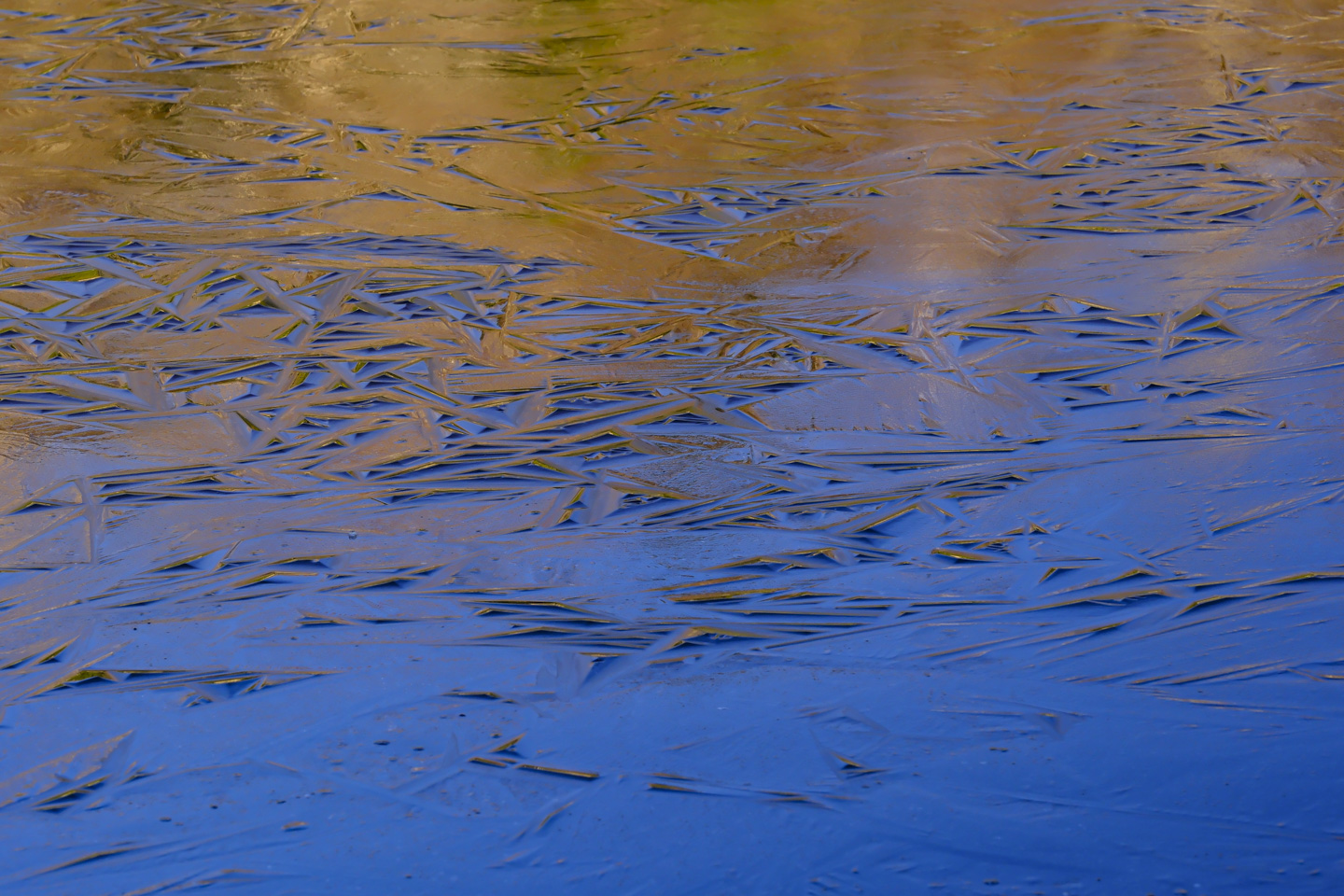 池の水面に薄い氷が張り始めたとき、このように立体的な幾何学模様が現れます。俯瞰して撮影すると青空が映り込み、模様の面白さを捉えることができます。隆起している部分や特徴的な形を探し、望遠レンズで切り取っています。模様の美しさを伝えるシンプルな切り取りですが、もう少し工夫して印象を高めたいと思います。