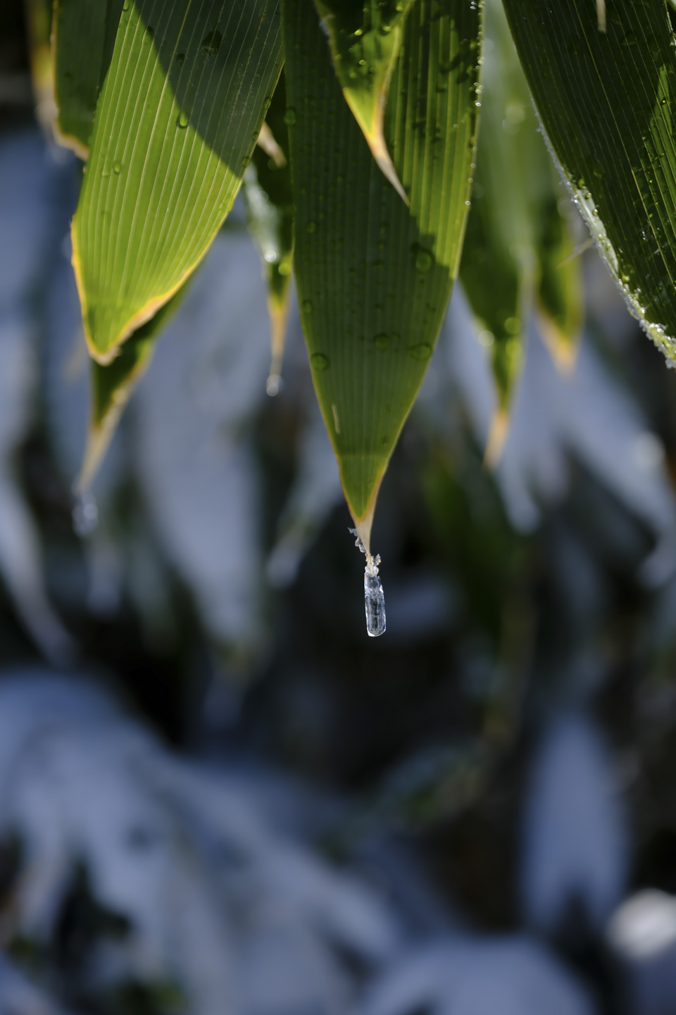 逆光方向に回り込み、目線を氷柱と同じ高さに合わせるようにして撮影しました。氷柱が逆光でキラキラと輝いて立体感を増し、背景に他の氷柱の玉ボケを入れることもできます。マクロレンズより望遠レンズで狙う方が背景の玉ボケを入れやすく、氷柱がついた植物の面白さを一緒に捉えることができます。主役の氷柱は、光が当たっているものを選ぶことが鉄則です。