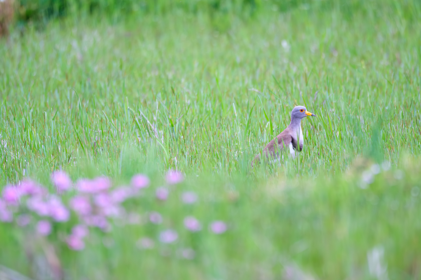 被写界深度を深くして(F値を大きくして)撮影することにより、野鳥だけではなく周囲の花々にもピントが合致し、より平面的な写真に仕上がってきます。