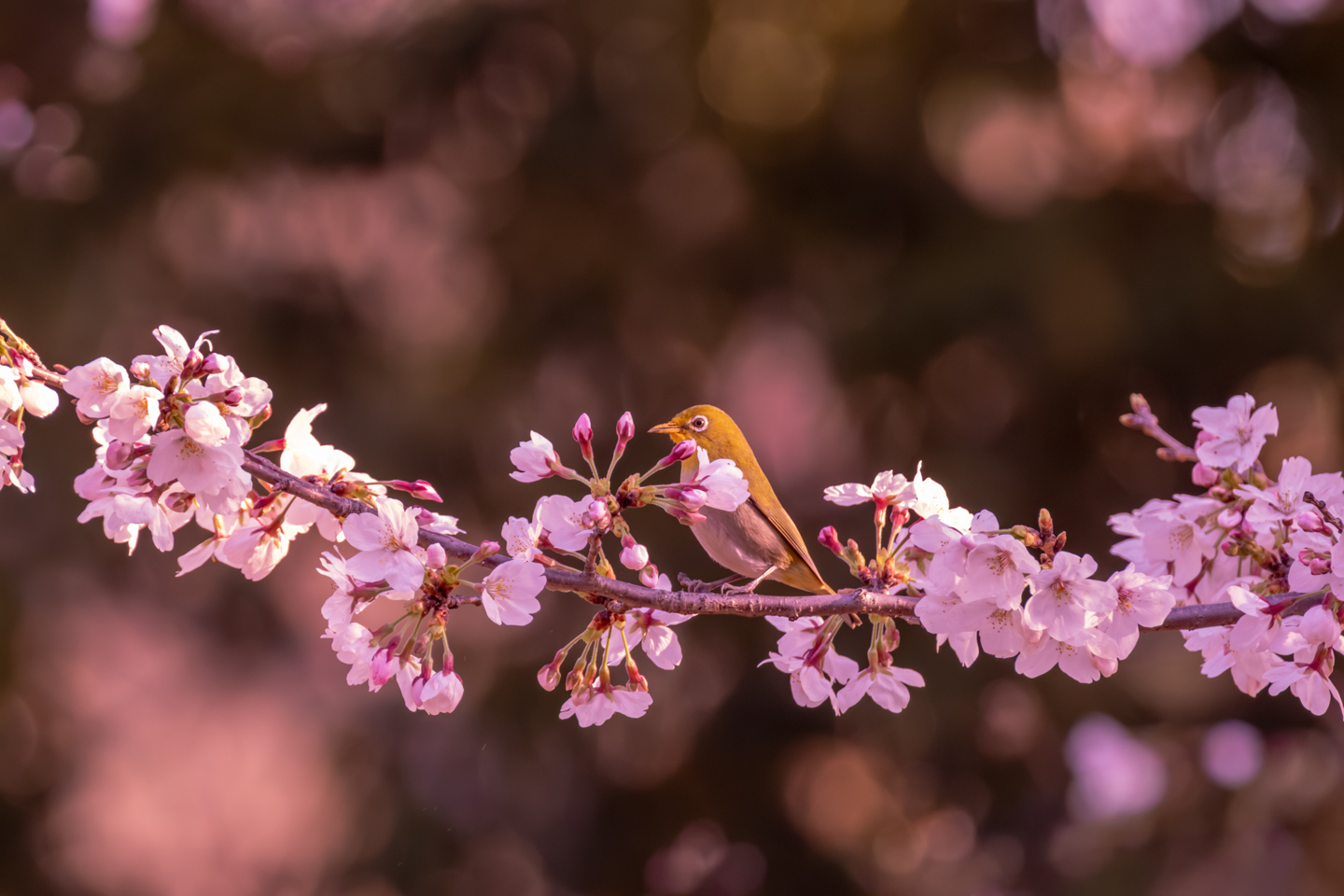 メジロも桜や梅などの花蜜に集まる野鳥の代表格です。集団で木々を点々としているので、1羽発見すると近傍に複数羽いる場合が多いです。