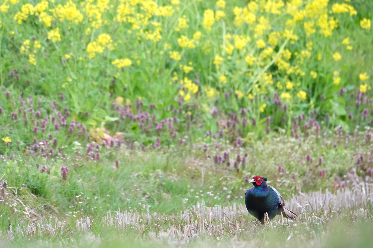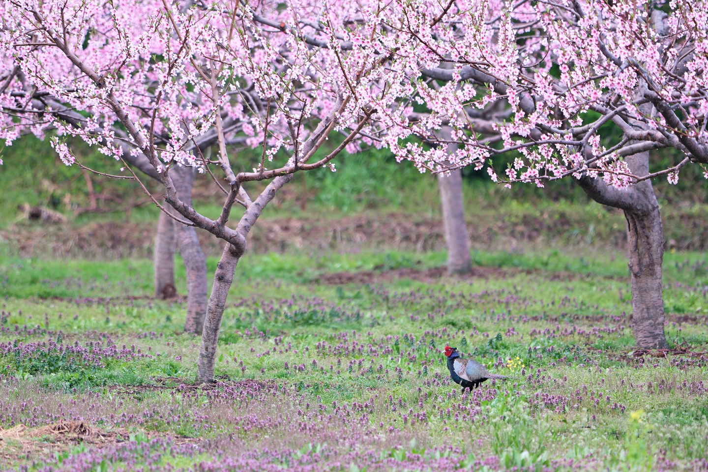 桃畑に現れたニホンキジのオス。桃の花は桜の花より濃いピンク色をしています。春のホトケノザは紫の小さな花を集団で咲かせるので、引きで撮影すると春めいた印象になります。