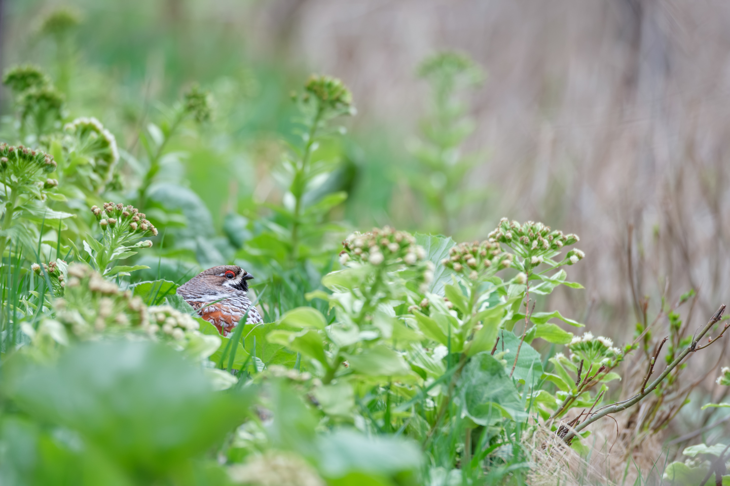 ふきのとうの中に佇む、日本では北海道のみに生息するエゾライチョウのオス。