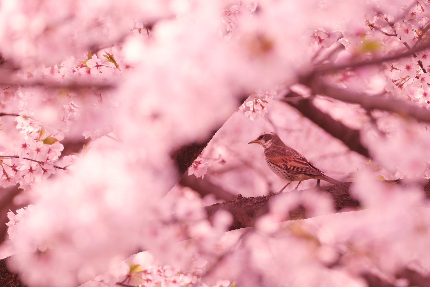 枝が入り組んだ満開の桜の枝に止まる一羽のツグミ。そのままではどう考えても「ただ撮っただけ」の写真にしかならないです。