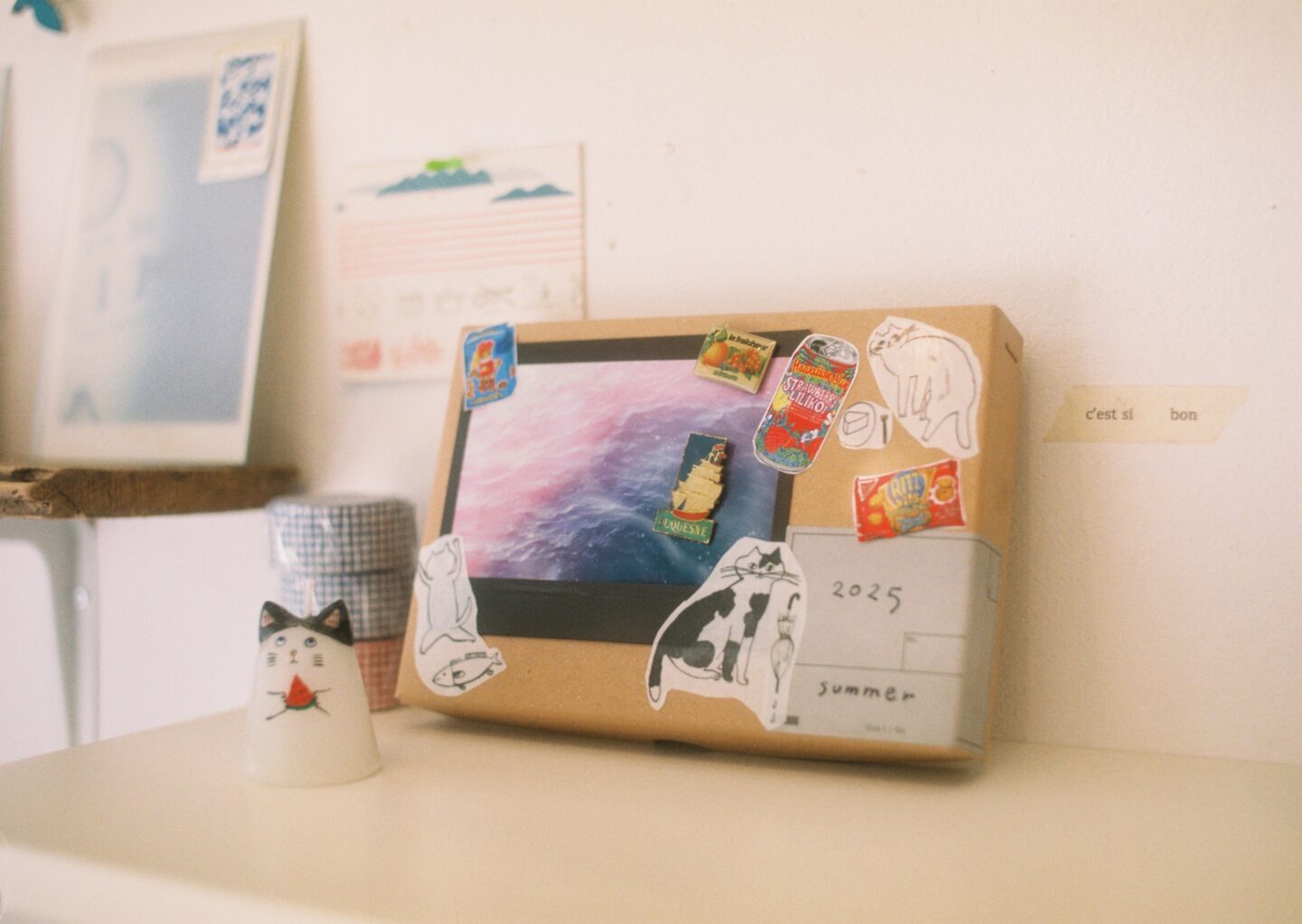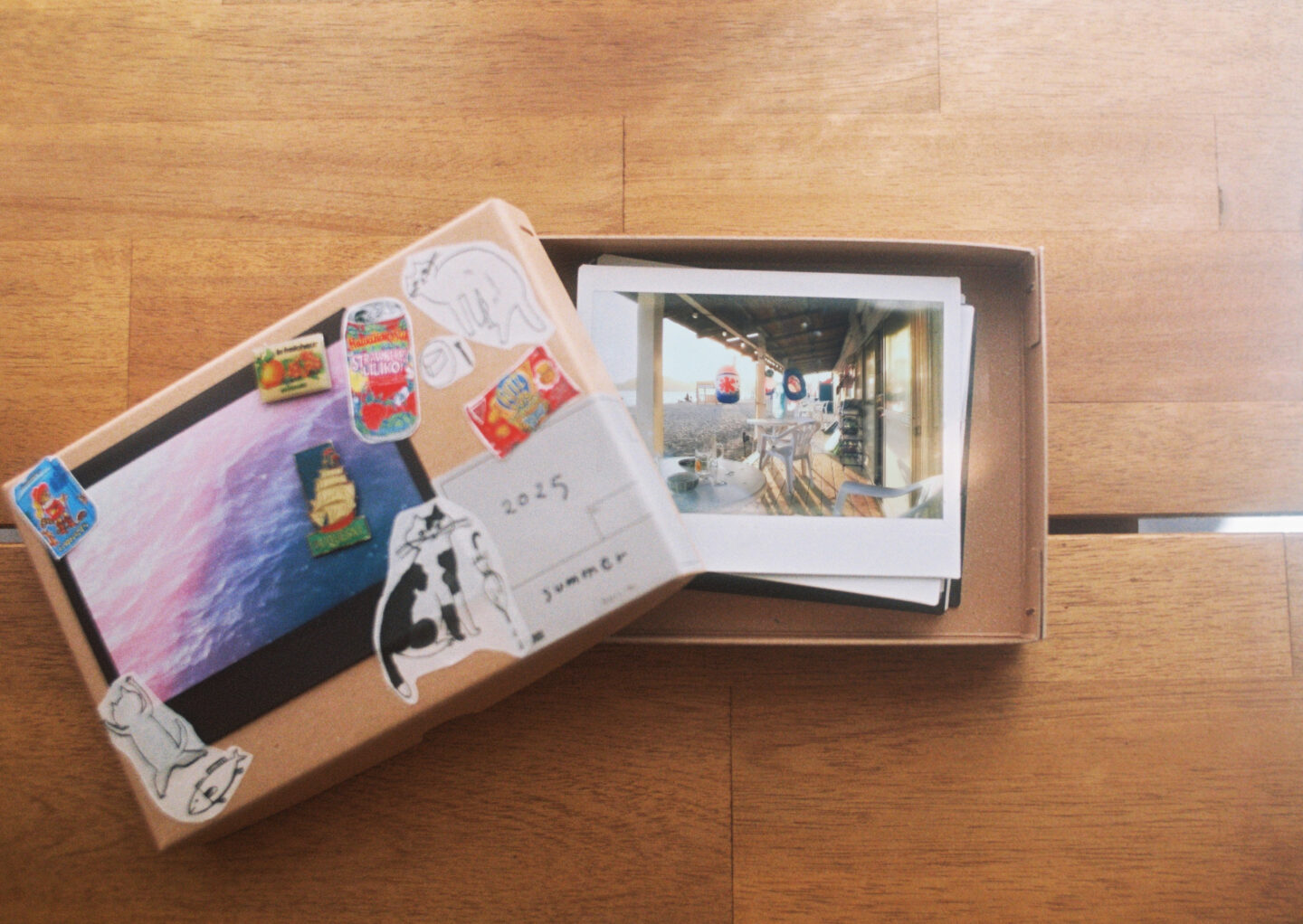 ↑これは、思い出の宝箱。無地の箱に、写真プリントやステッカー、ピンバッチでデコレーションしたもの。チェキプリントを入れて保存☆
