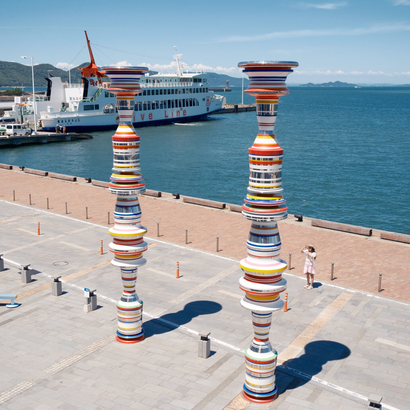 今回の旅ではX-E5とXF23mmF2.8 R WR、カメラとレンズ1本のみで行きました。瀬戸内のどこまでも凪が続く静かな海や、青空と島のアートに触れる光景に合う雰囲気をイメージして選んだフィルムシミュレーションは「ノスタルジックネガ」。フィルムシミュレーションダイヤルの中に入っていないので「フィルムシミュレーションダイヤル設定」でFS1に割り当てました。少しカスタムするだけで使いこなしている感じがします。さらに、画質の効果として「カラークロームブルー」をON。「強め」にすると青の表現がぐっと深まるので、空や海、影の中に潜む青がより深く印象的に写ります。