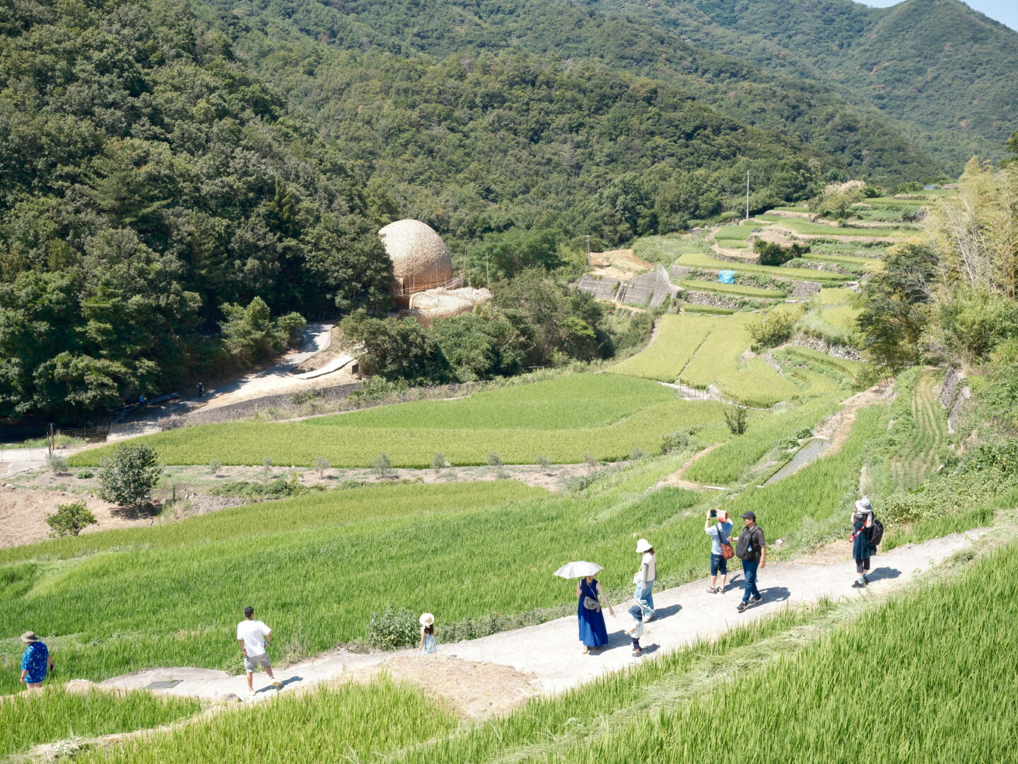 山々に囲まれた棚田の中にアート作品がありました。アートへ向かう道を歩く人それぞれの様子も夏らしい光景です。太陽が眩しく、ファインダー越しにのぞくと棚田や木々のナチュラルな色は目に優しく、広がる風景が長閑で美しいです。アスペクト比を変えたレバーを一回引くとファインダーの表示方法を変えられました。「長引き」と「引き」で切り替えられる操作もユニークで便利に感じます。